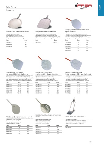 • Pala para pizza rectangular, ligerísima y flexible, mango de 150 cm • Pala para pizza circular perforada en aleación de aluminio • Pala para pizza rectangular perforada en aleación de aluminio